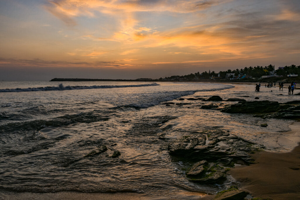 kanyakumari sunset, beach sunset india, golden hour sunset, rocky beach, sea waves, evening sky, nature photography, tamil nadu beach, sunset reflection